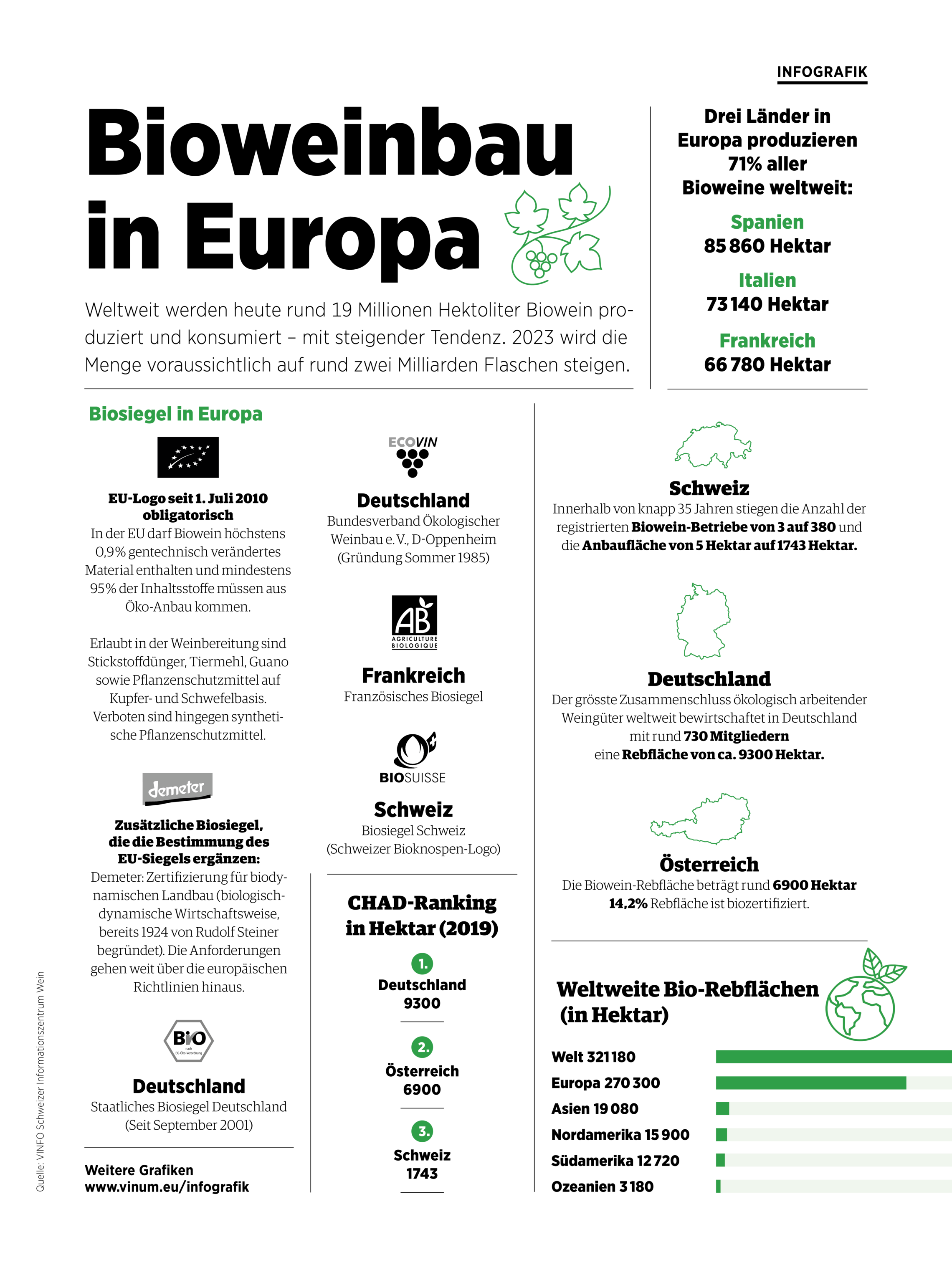 Weltweit werden heute rund 19 Millionen Hektoliter Biowein produziert und konsumiert – mit steigender Tendenz. 2023 wird die Menge voraussichtlich auf rund zwei Milliarden Flaschen steigen.
