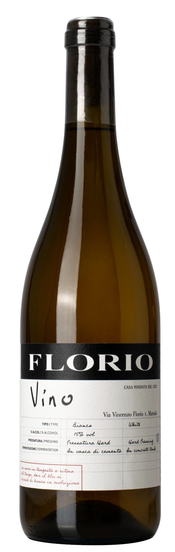 Jeder Marsala der Cantine Florio beginnt mit dem Vino Florio, ein reinsortiger Grillo, der in Zementtanks vergoren wird. Die Trauben wachsen im Westen Siziliens und reifen voll aus. Bei der Weinbereitung wird auf eine kraftvolle Extraktion der Aromen geachtet, um das volle Potenzial zu erhalten, das von intensiver Farbe, hohen trockenen Extrakten und deutliche salzigen Noten geprägt ist. Vino Florio wird mit regelmässiger Sauerstoffzufuhr ausgebaut. Der ungefilterte Weisswein zeigt eine ausdrucksstarke Nase, klare hefige Noten, sehr pikant. Er weisst eine Herbe auf, die sehr anziehend ist, Limettenzeste, auch Anklänge an Akazienblüten und Orangenblüten. Dicht und intensiv. Am Gaumen mit viel Schmelz, mundfüllend, legt sich an die Wangeninnenseiten, delikate Würze, kraftvoll, kantig und fordernd. Im Abgang findet sich die Kraft wieder und hallt nach.