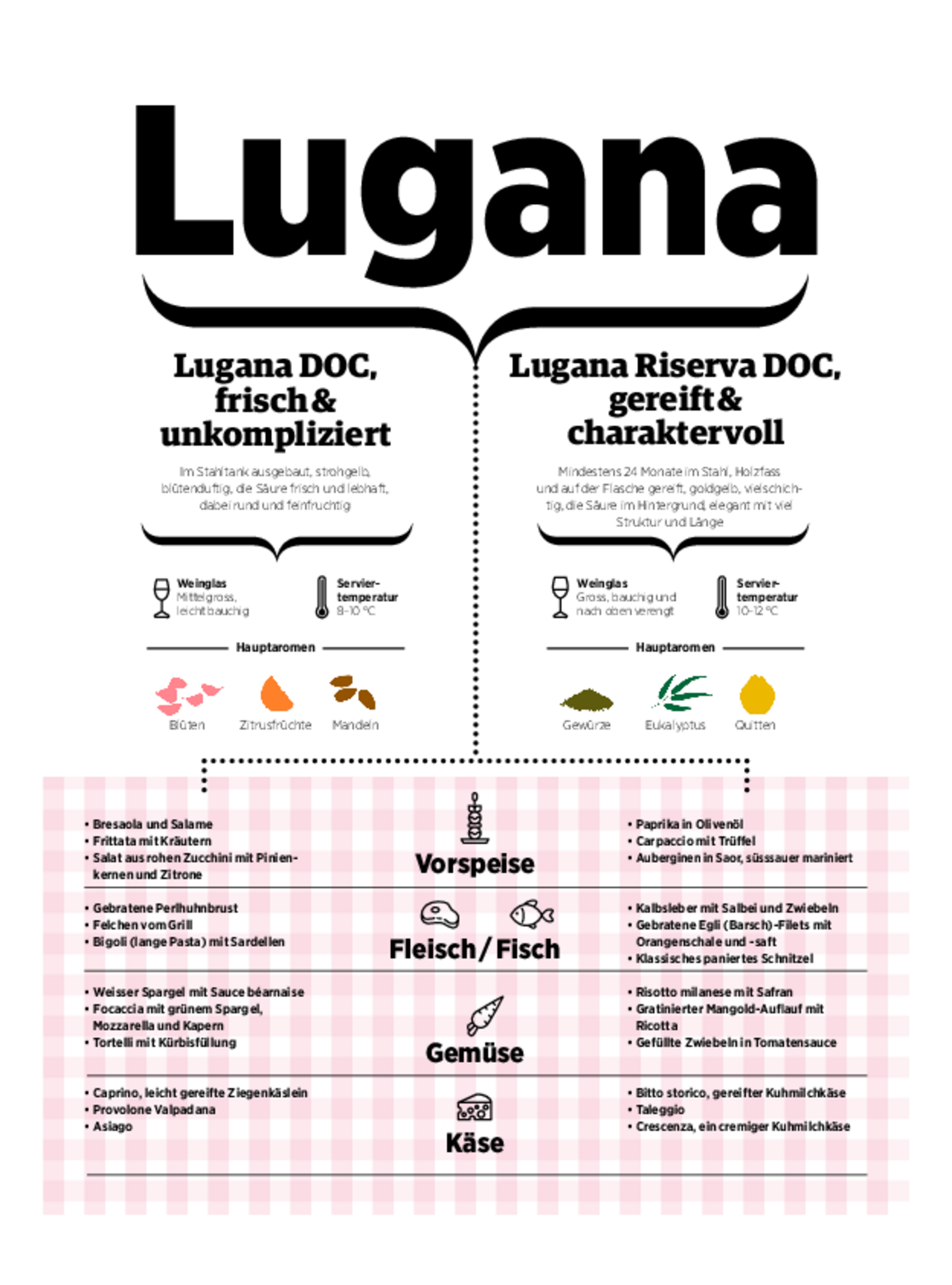 Verwaltungstechnisch teilt sich das kleine, feine Gebiet Lugana in vier Gemeinden in der lombardischen Provinz Brescia im Westen und eine im Veneto auf, Peschiera del Garda am östlichen Ende. Dieser Spagat macht sich auch in der Küche bemerkbar, hier trifft die Fülle der Lombardei mit Risotto und Polenta, Mascarpone, Bitto und Bagòss, Bresaola und Salame, Cotechino und Ossobuco auf die Gewohnheiten und Vorlieben des Veneto, vereinen sich Olivenhaine vom Ostufer mit Agaven, Kapernsträuchern und Orangerien des Westufers. Da werden Nudeln wie die dicken langen Bigoli oder Tortelli mit Kürbisfüllung serviert, vor allem aber eine Vielfalt von Fischgerichten, für die das «Süsswassermeer» des Gardasees die Grundlage liefert.
