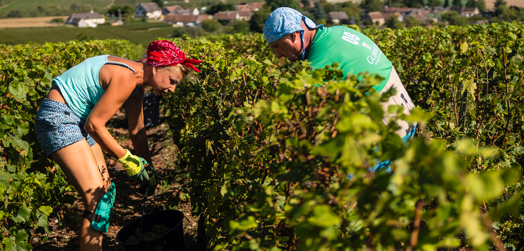 «Hier in der Champagne passiert die Lese obligatorisch von Hand. Ein echt menschliches Abenteuer, manchmal ganz schön stressig und immer mit minutiöser Organisation verbunden, denn die Trauben warten nicht auf uns! Wir arbeiten mit Equipen aus Polen und Litauen, die ganze Arbeit leisten.»