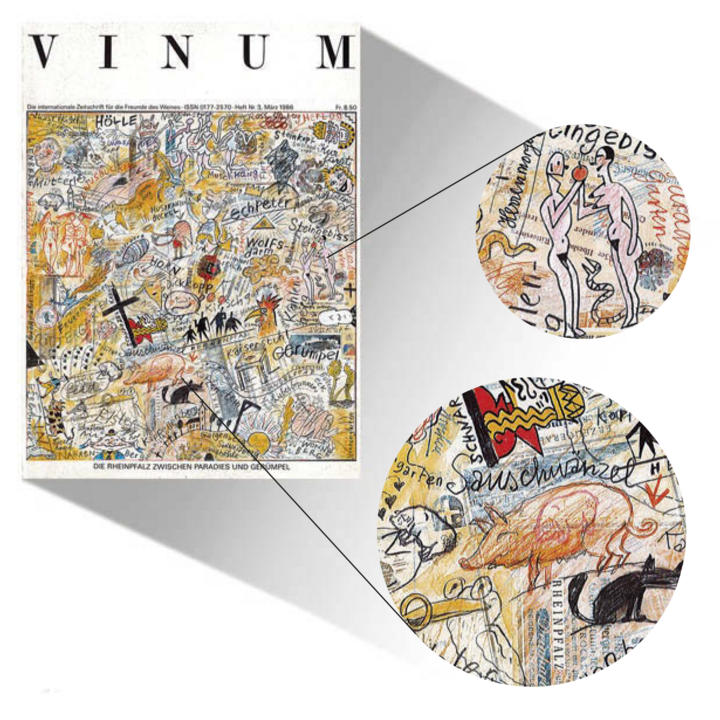 Das Jahr 1986 läutete VINUM mit einem Paukenschlag ein. Nach fünf Jahren mit eher biederen Covers (Ampelografien, Ofenkacheln, Stiche aus mittelalterlichen Weinbüchern) katapultierte der Zürich Künstler Willi Rieser (1936 bis 2016) das Heft mit seinen akribisch-detailversessenen, vor allem aber auch provokativen Cover-Illus in die Neuzeit. Mit Karikaturen zu Lagennamen aus der Pfalz wie «Venusbuckel» oder «Sauschwänzel» (3/1986) oder mit nackten Mädels im Pariser Art-Deco-Stil der 20er Jahre zum Artikel «Die Verführung des Champagners» (7/1986) scheuchte er die VINUM-Leser aus ihren Fauteuils. Zwar sollte die Cover-Kunst-Phase von VINUM bis 1994 dauern, doch so explosiv wie im ersten Jahr gerieten die Illus danach nicht mehr.