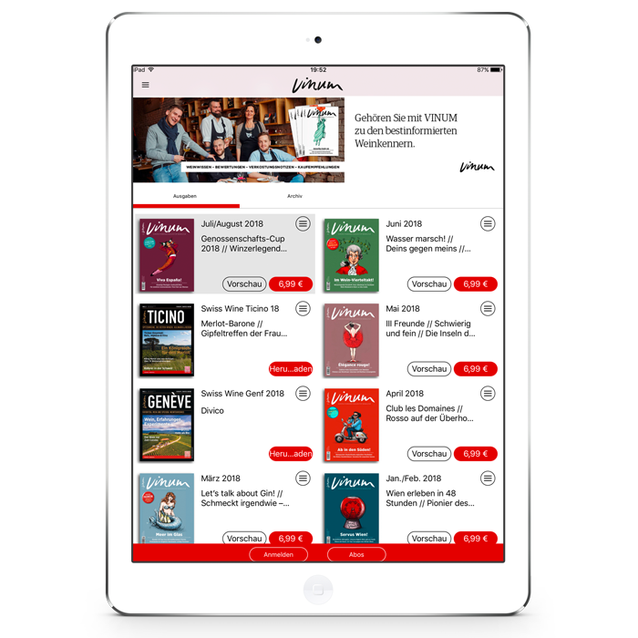 In der neuen VINUM-App finden Sie die geballte Weinkompetenz von VINUM. Neben den Magazinen, erhalten Sie zahlreiche Themen- und Regionen-Specials wie z.B. World of Bordeaux, Top of Portugal, Schweizer Weinregionen oder das Champagner-Extra gratis.