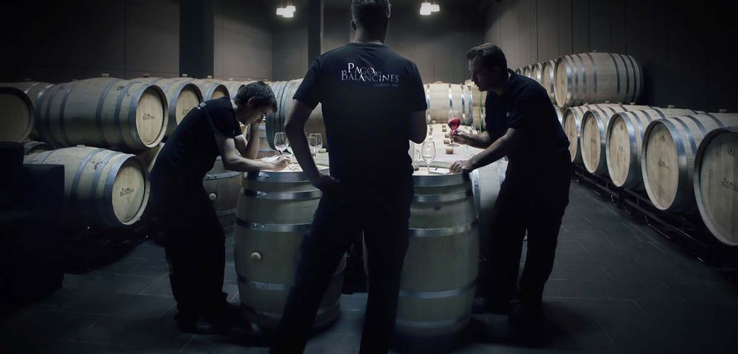 Der Zugang zur modernen Kellerei mit ihrer graphischen Fassade führt zwischen zwei flachen Wasserbecken hindurch, die für die Kühlung des darunterliegenden Fasskellers sorgen. Nach fast zehn Jahrgängen in einer gepachteten Bodega und dem Master in Önologie an der Uni Madrid hat Pedro Mercado seine eigene entworfen und erbaut. Von aussen kein spektakuläres Gebäude. Aber jedes Detail hat der Winzer-Architekt genau bedacht. Vor allem die enormen Aussentemperaturen. Aber auch jeder beim Weinmachen notwendige Handgriff fand seine Umsetzung. Unten im weiten Treppenschacht, der zum Fasskeller führt, treffen sich Pedro und seine Leute unter zwei gigantischen Mastiff-Porträts zum Austauschen und Entspannen, denn dort ist es im Sommer am Kühlsten. «Der entscheidende Faktor bei uns ist», betont er, «dass wir ein Team haben, das für Pago los Balancines lebt und sich mit Leib und Seele dem Projekt verschreibt.»