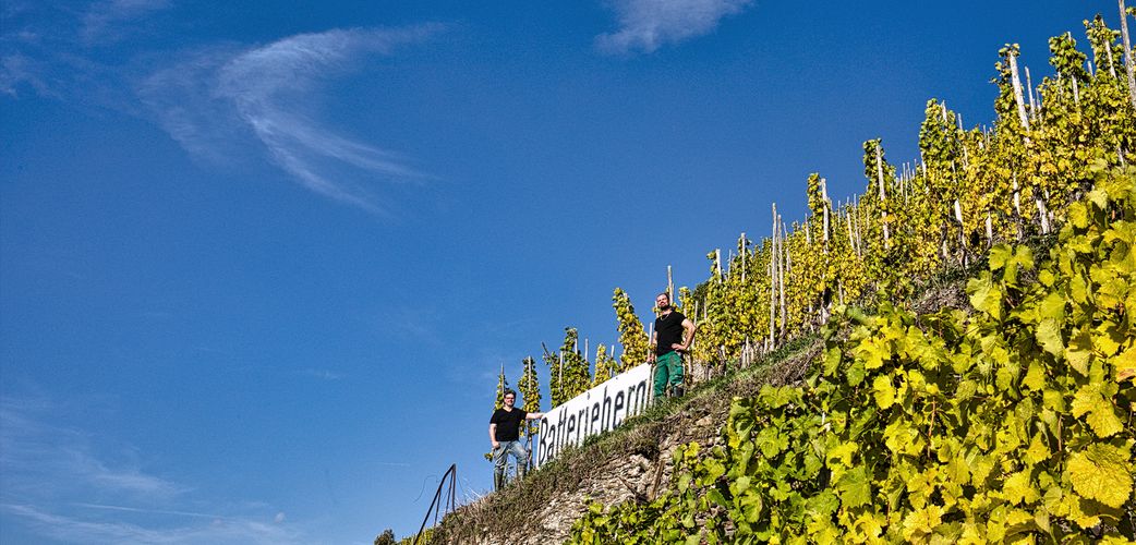 Weil man mit dem gebürtigen, aber schon in der Jugend weinbegeisterten Westfalen Gernot Kollmann (vorher Dr. Loosen, Bischöfliche Weingüter Trier, Van Volxem, Knebel) einen tatkräftigen Betriebsleiter mit einem Gespür für steile Mosellagen fand, erlebte der Betrieb bald einen Aufstieg wie der sprichwörtliche Phönix aus der Asche! Das Gut, bei der Übernahme nur 3,4 Hektar gross, konnte wieder wachsen. Flächen wie Enkircher Steffensberg und Trabener Zollturm passten ideal in das steile Ensemble, weil auch hier viele alte, wurzelechte Reben wachsen. Die 1,1 Hektar umfassende Monopol-Lage Batterieberg blieb natürlich das Aushängeschild. Sogar etwas Spätburgunder (Enkircher Monteneubel) bereichert das Sortiment mit profilierten Rotweinen. Und Sekt Brut Nature mit vier Jahren Hefelager! Die Eigentümer lassen ihrem Team vor Ort freie Hand und sind selbst sehr glücklich mit der Stilistik der Weine, mit denen an die besten Zeiten von Immich-Batterieberg angeknüpft wird.