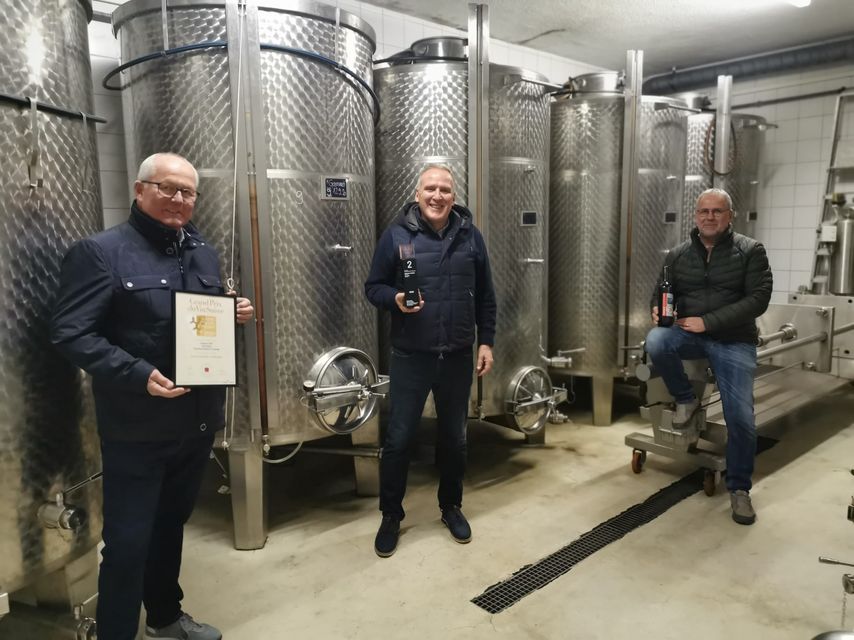 Die 3 Mitglieder der Germanus Kellerei: Urs Schmid mit Gamaret Flasche, Reinhard Schmid mit Pokal und Hans Brun mit Urkunde